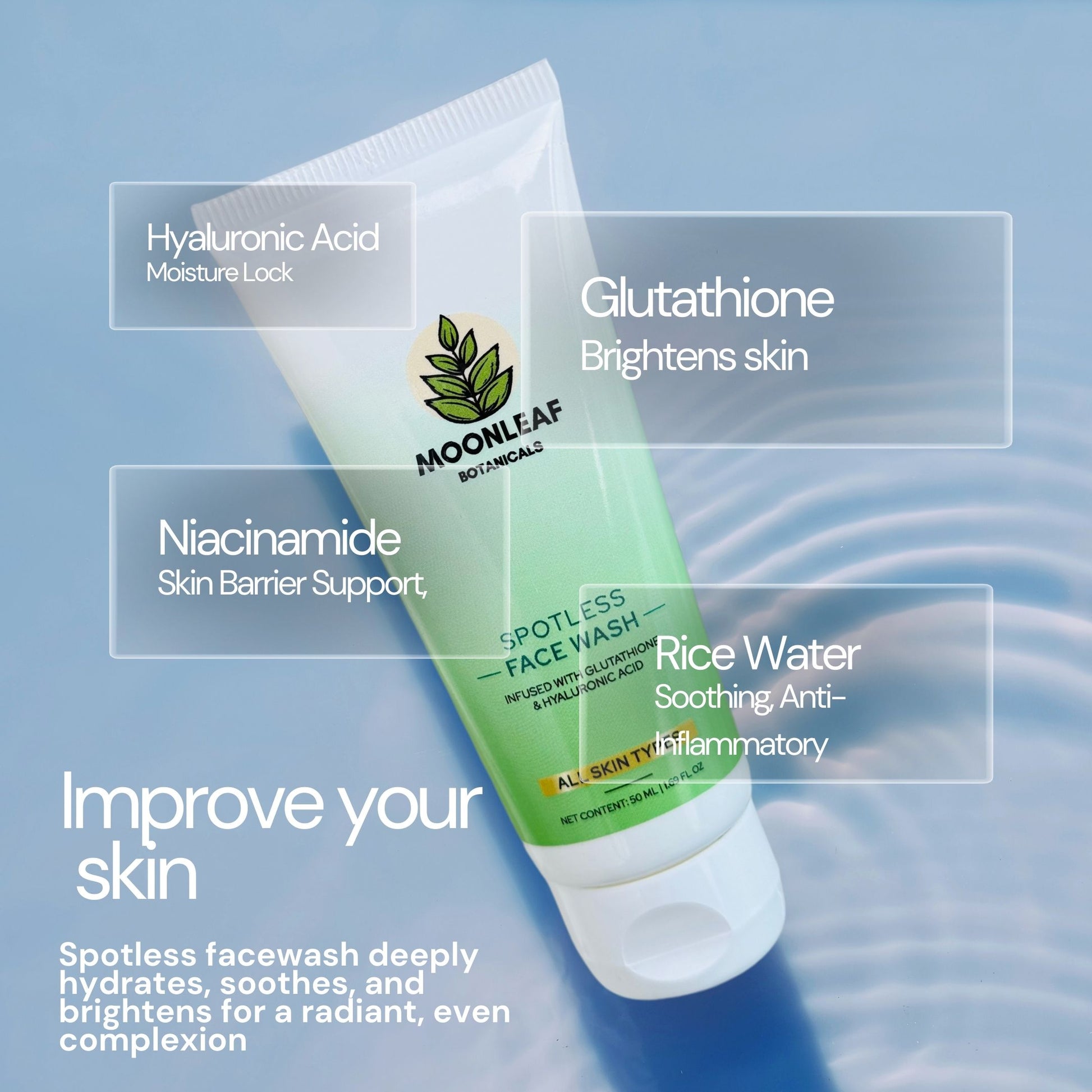 Unveil your skin's natural radiance with Moonleaf Botanicals Spotless Facewash, a luxurious blend of Niacinamide, Salicylic Acid, Glutathione, Hyaluronic Acid, and Rice Water, infused with the delicate fragrance of Lily. This gentle yet effective formula cleanses, brightens, and hydrates your skin, providing a refreshing and revitalizing experience with every wash.